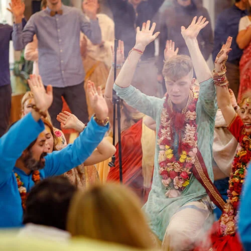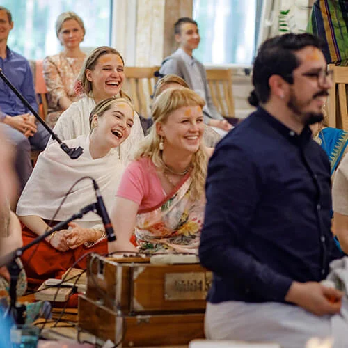 Madhuri Kunj is a residential ashram, where devotees live full time, while others visit on weekly basis. Daily we gather to meditate, chant mantras, and read sacred texts. The program begins at 5:00 AM with sacred prayers and deities’ worship rituals. Afterward, everyone engages in different services such as preparation of prasadam, book translation, cow seva, and other household activities. Daily we gather for classes on various spiritual subjects, followed by evening maha-mantra kirtan.