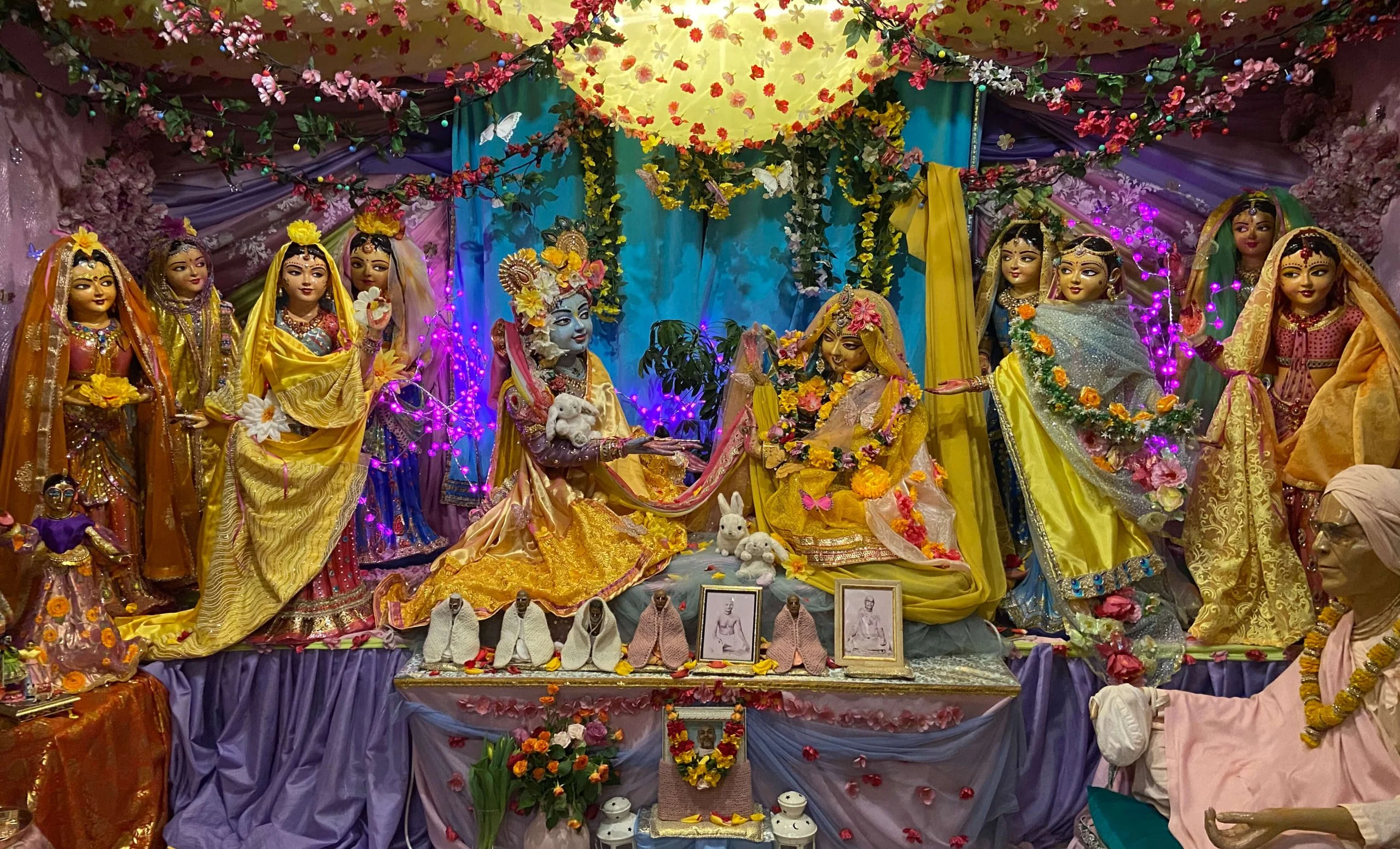 From left: Sri Rati Manjari, Sri Citra Devi, Sri Vinoda Manjari, Sri Campakalata Devi, Sri Krshna, Sri Radha, Sri Visaka Sakhi, Sri Nilima Manjari, Sri Lalita Sakhi, Sri Rupa Manjari.